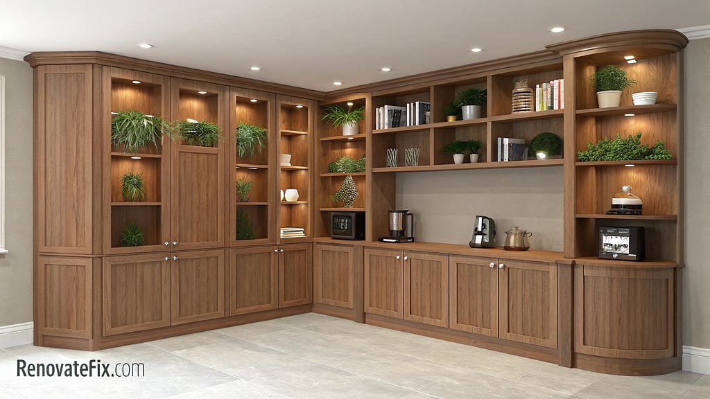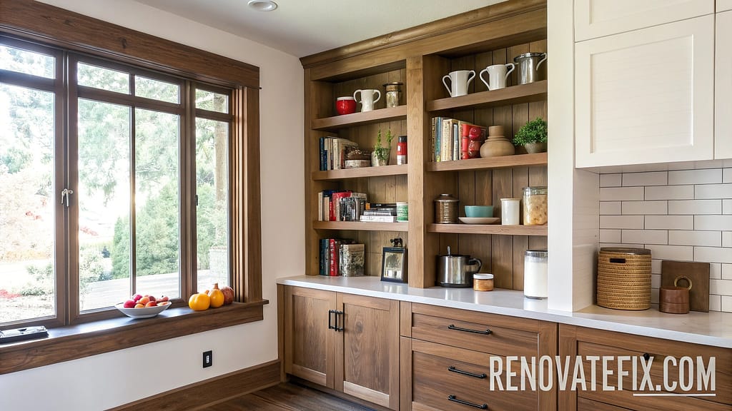 These integrated solutions create depth without protruding into living areas, perfect for compact kitchens seeking additional storage options.