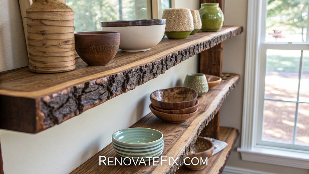 Natural wood slabs with preserved bark edges bring organic beauty indoors.