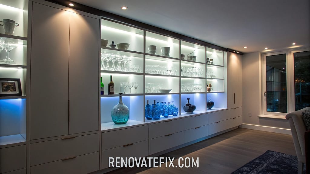 LED strips illuminate wall-mounted shelves from behind, creating ambient lighting effects.