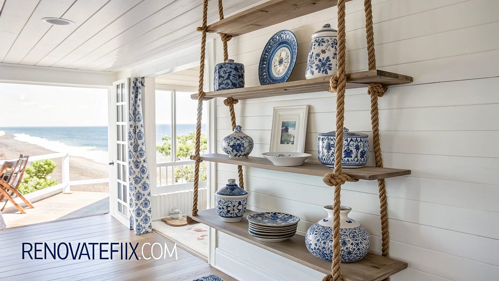 Natural fiber ropes support wooden planks, creating nautical-inspired storage solutions.