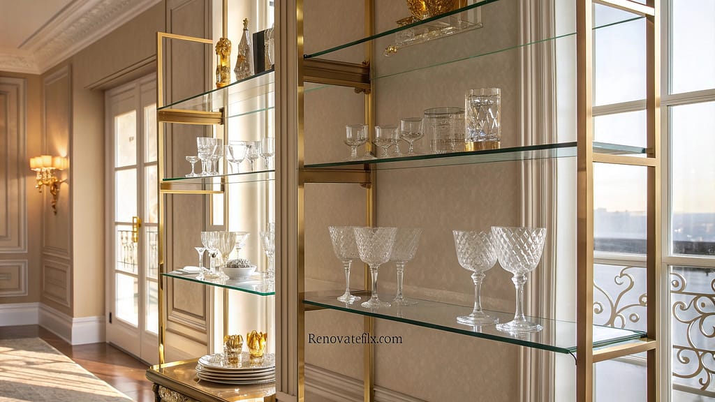 These refined pieces reflect light beautifully while displaying cherished items, creating an upscale look perfect for luxurious kitchen designs.