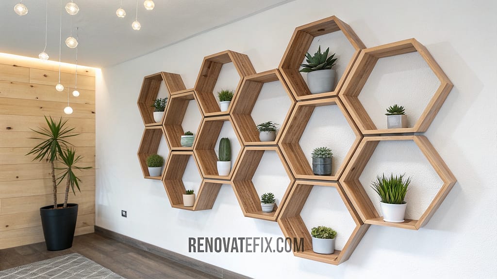 Hexagonal shelf arrangements create honeycomb-inspired storage solutions.