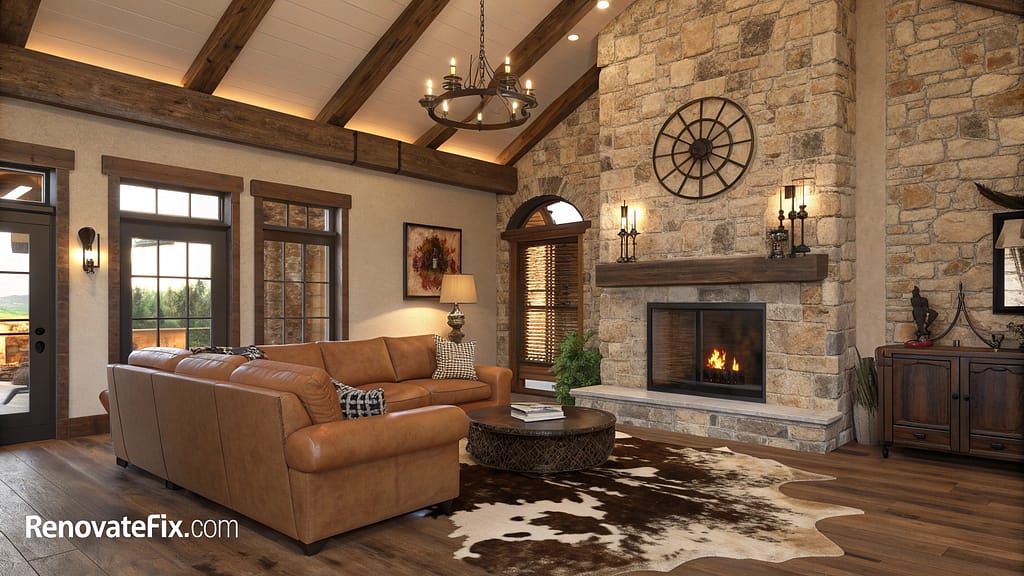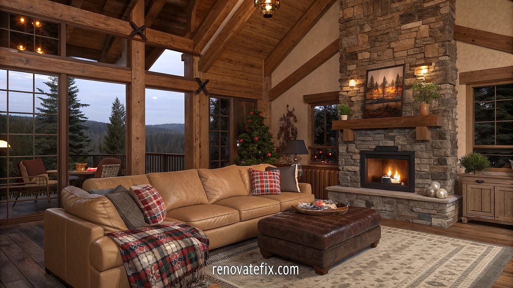 Plaid wool throws and cognac leather pillows add warmth while a stone fireplace commands attention.