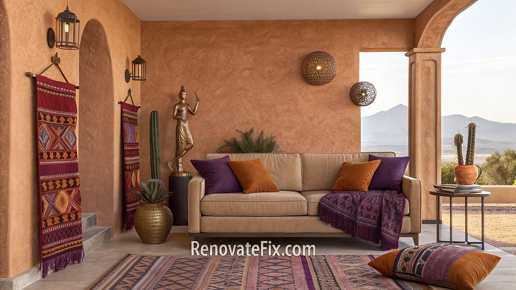 Sunset orange and deep purple pillows mirror desert sky colors while brass geometric sculptures catch light.