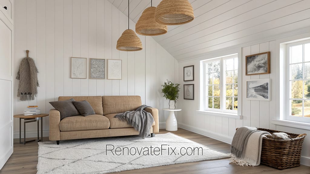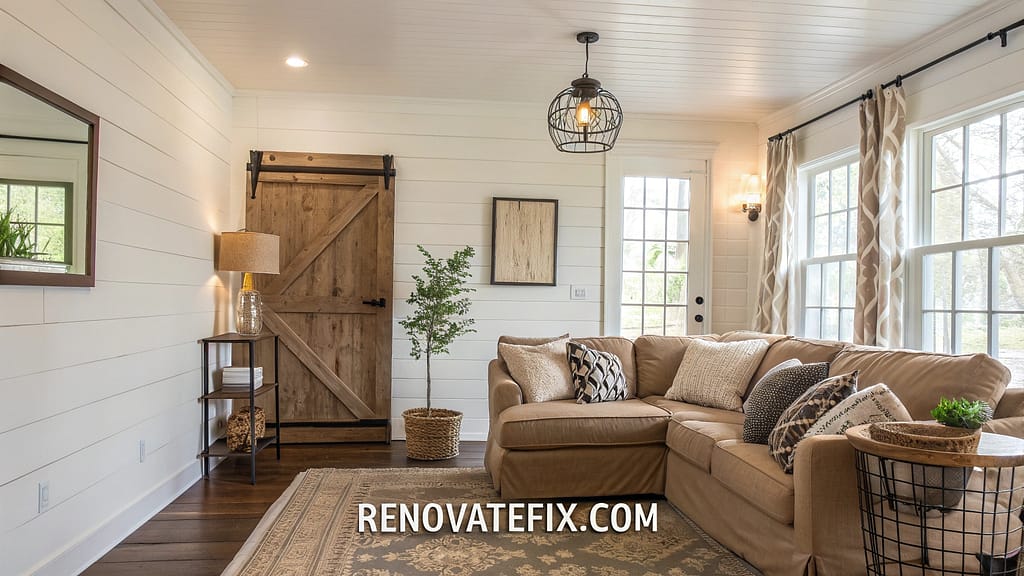 Shiplap walls painted soft white embrace a tan slip-covered sofa adorned with grain sack pillows.