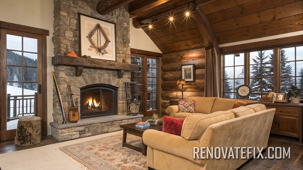Faux fur throws add luxury while vintage ski posters bring nostalgic charm.