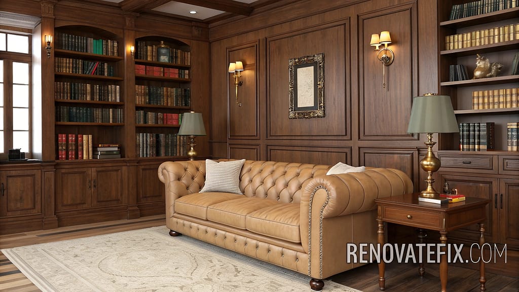 Floor-to-ceiling bookshelves surround a tan leather Chesterfield sofa while brass reading lamps provide focused light.