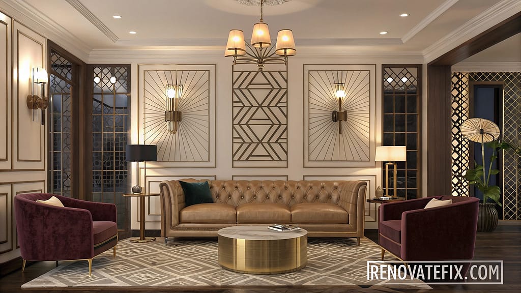 A streamlined tan leather sofa anchors this sophisticated space featuring black and gold geometric patterns.