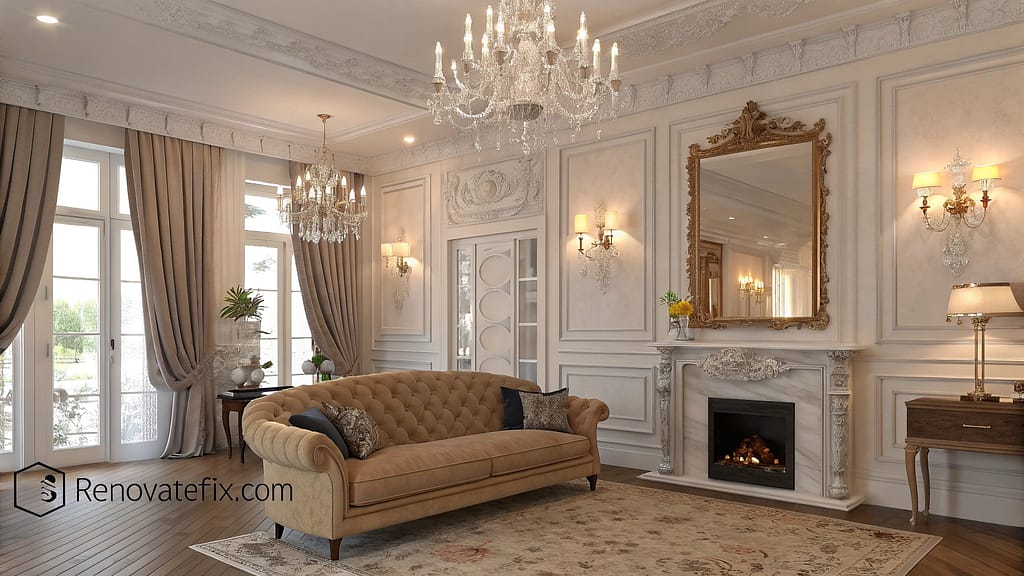 Crystal chandelier crowns a tan velvet sofa while ornate mirrors reflect gilt details.