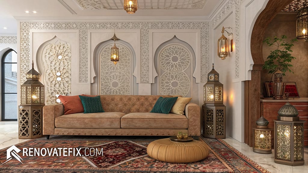 Jewel-toned pillows pop against a tan velvet sofa while intricate metal lanterns cast dancing patterns.