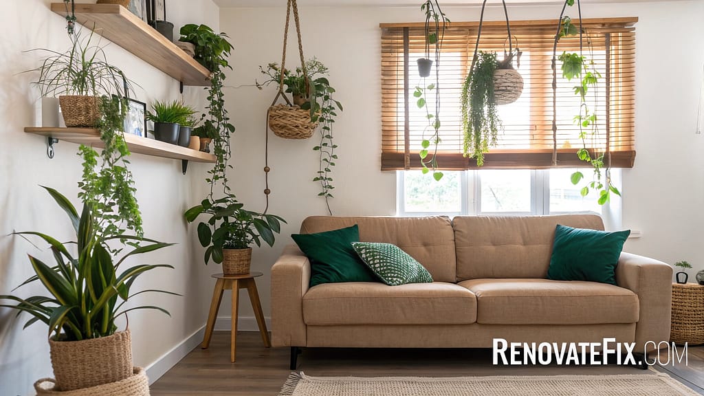 Lush green plants cascade from macramé hangers, surrounding a plush tan fabric sofa.