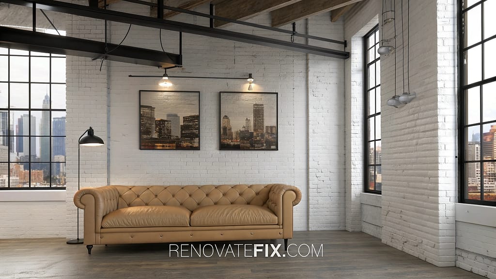 Exposed brick painted white highlights a tan leather sofa while factory windows frame city views.