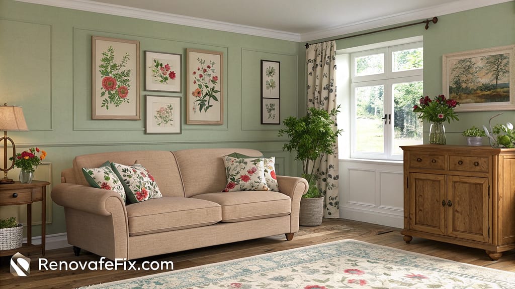 Floral chintz pillows grace a tan linen sofa while botanical prints line sage green walls.