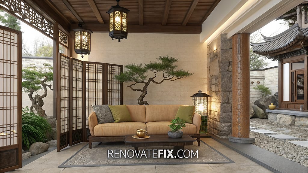 Stone garden features create peaceful sounds while bonsai trees add living art.