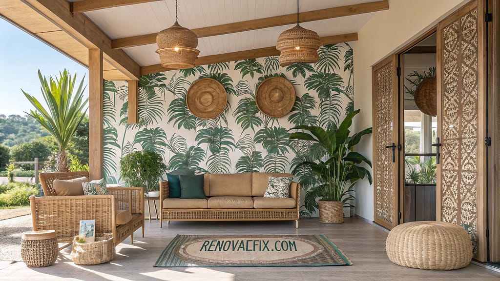 Palm leaf wallpaper surrounds a tan rattan sofa while woven pendant lights create ambiance.