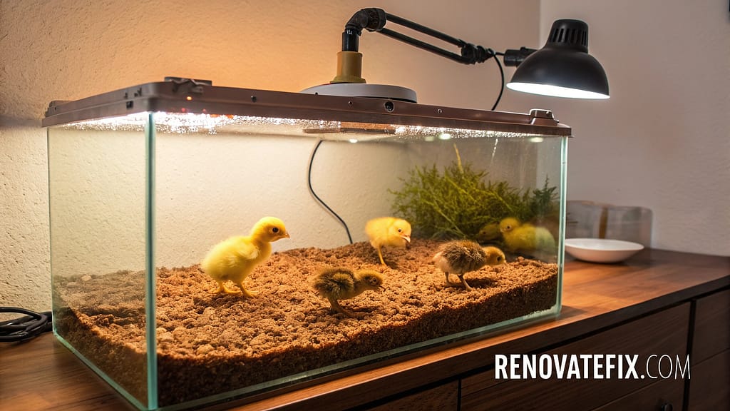 Glass aquariums repurposed as brooders provide exceptional visibility from all angles, allowing careful observation of chick behavior while maintaining consistent internal temperatures regardless of room conditions.