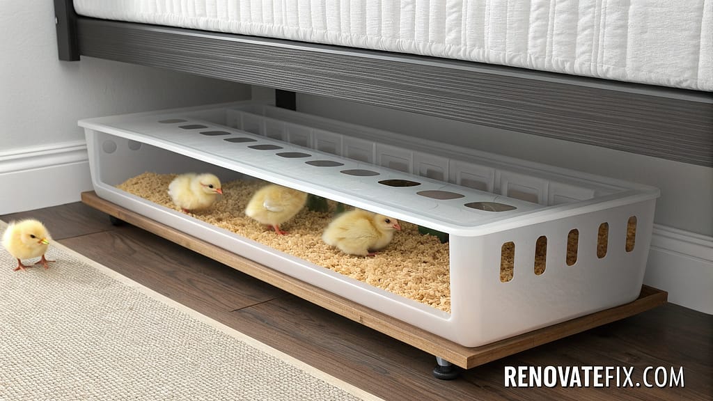 Flat, wide under-bed storage containers create perfect low-profile brooders that slide easily under heat lamps while fitting conveniently into space-challenged areas like apartments or utility rooms.