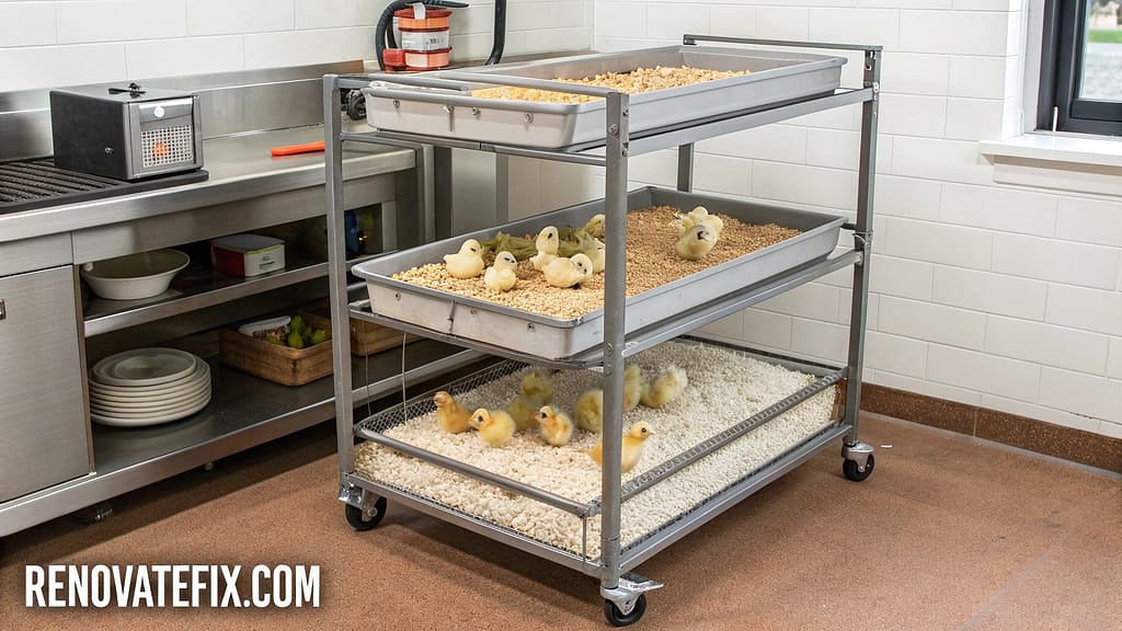 Multi-tiered utility carts transform into mobile brooding stations rolling effortlessly between indoor spaces based on daily temperature fluctuations or cleaning needs without disturbing chick environments.