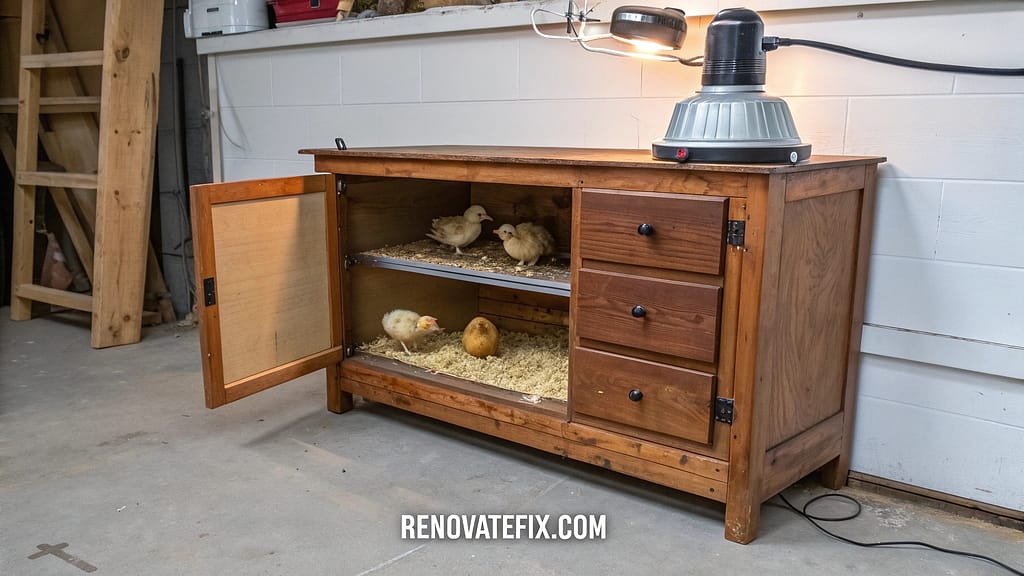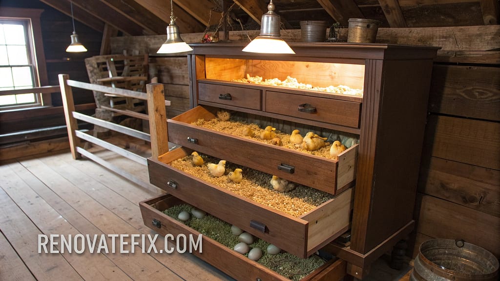 Removing drawers from old dressers creates instant multi-compartment brooding systems with different sized spaces accommodating chicks through various growth stages simultaneously.