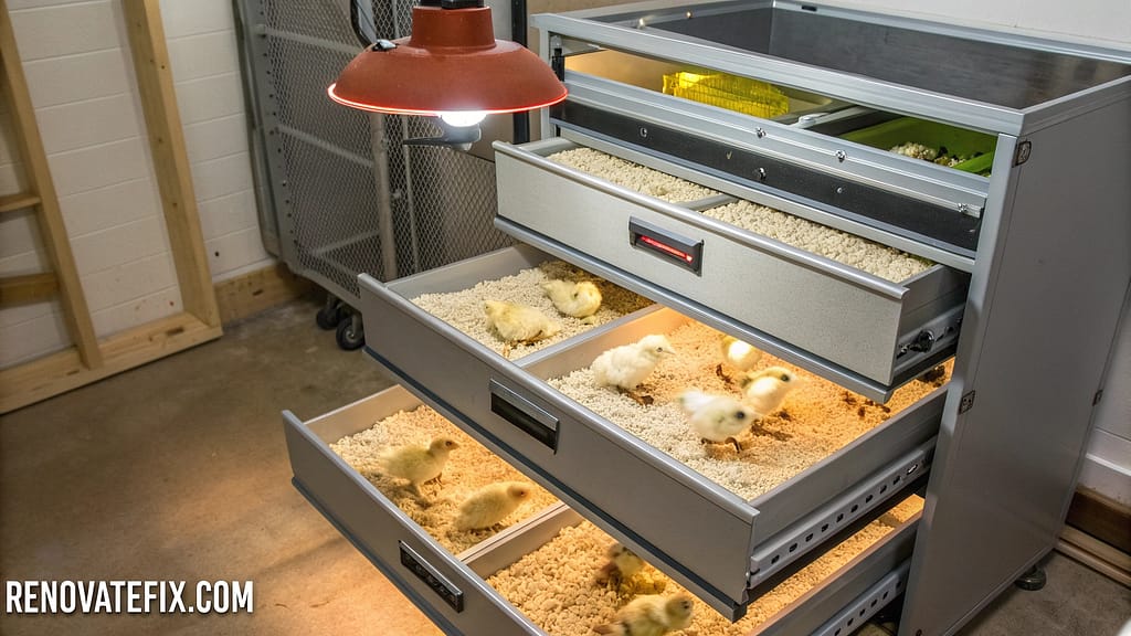 Empty filing cabinet drawers lined with appropriate bedding form instant pull-out brooders perfect for monitoring multiple age groups separately while occupying minimal floor space in crowded work areas.