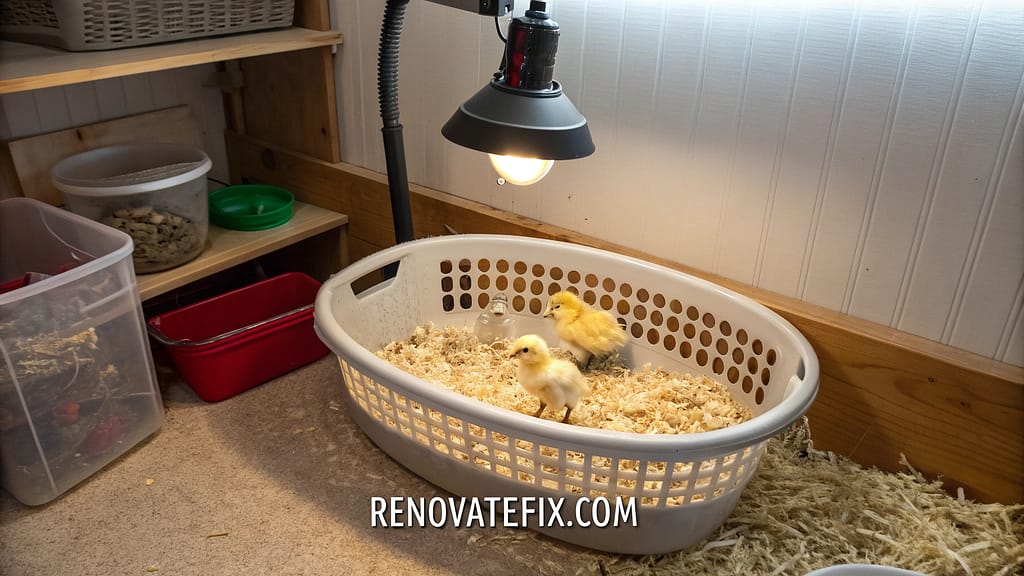 Plastic laundry baskets provide instant low-cost brooders with built-in ventilation patterns preventing moisture buildup while maintaining adequate warmth through strategic positioning under heat sources.