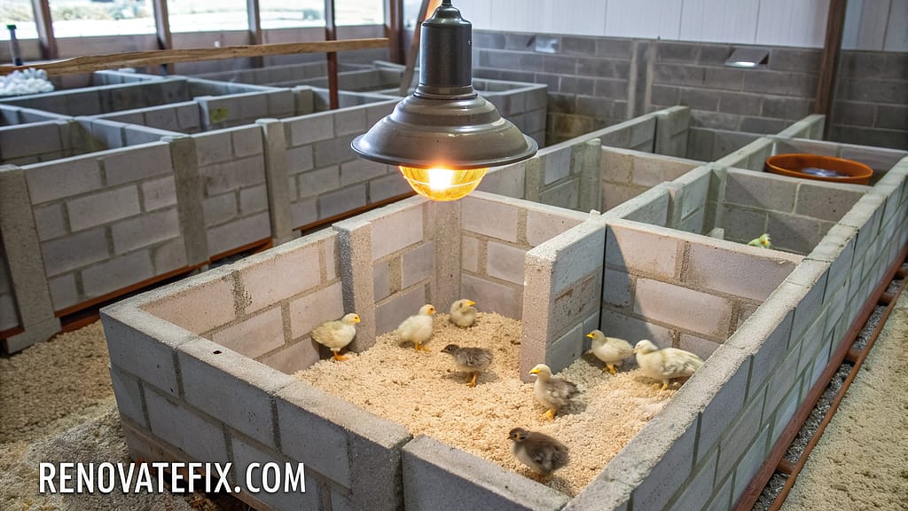 Arranging concrete blocks into rectangular formations creates instantly stable brooder boundaries with excellent thermal mass properties, absorbing daytime heat slowly releasing it overnight when temperatures typically drop.