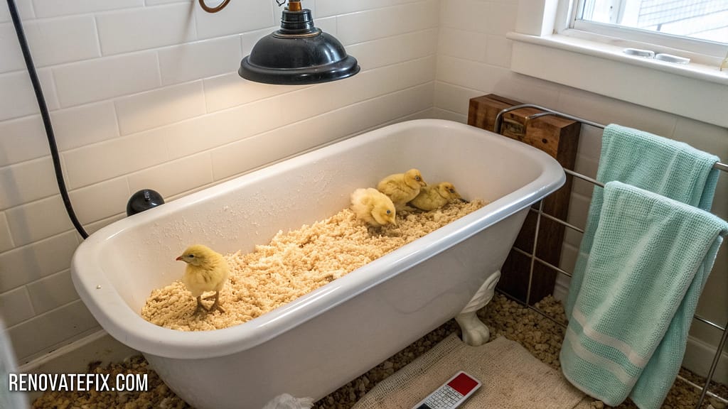 Utilizing an unused bathtub creates an instantly available brooder with built-in draft protection and easy-clean surfaces ideal for emergency situations or unexpected early arrivals needing immediate shelter.