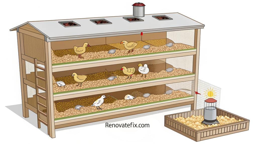Developing a multi-level brooder with connecting ramps addresses different maturation stages simultaneously, utilizing vertical space efficiently while teaching chicks navigation skills that prepare them for eventual coop environments.