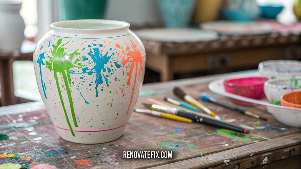Carefully flick and spray multiple colors across pot surfaces, building layers of spontaneous artistic expression.