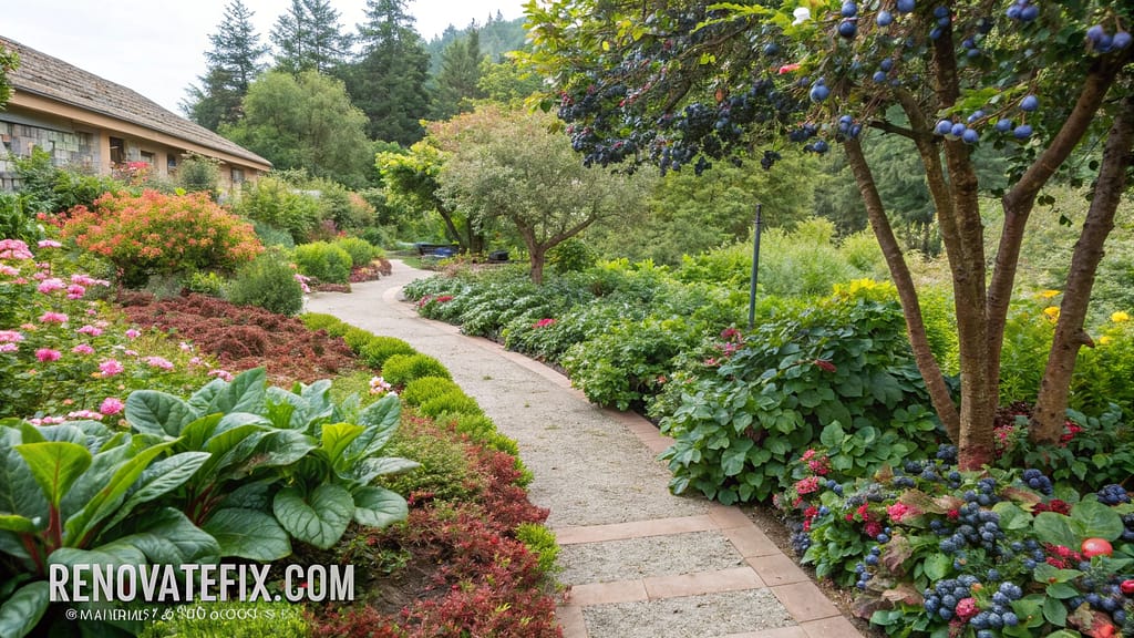 Blend ornamental plants with productive fruit trees, berry bushes, and attractive vegetables to create a beautiful setting that also provides fresh homegrown produce throughout growing seasons.