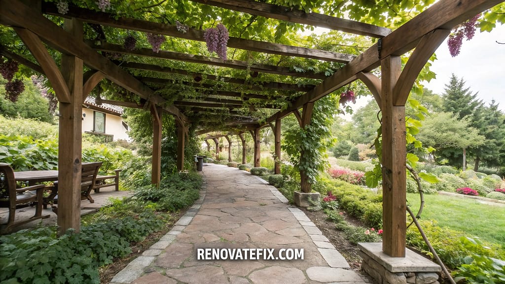 Plant fast-growing vines like grapes, kiwi, or annual climbers on sturdy frameworks to create seasonal shade canopies, green tunnels, or living roofs that provide cooling relief during hot months while producing edible harvests or spectacular floral displays.