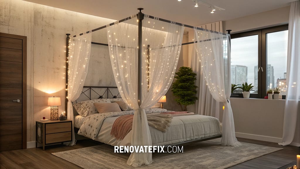 Update traditional four-poster structure with lightweight fabric panels, string lights, or botanical elements that create sense of enclosure without heaviness.