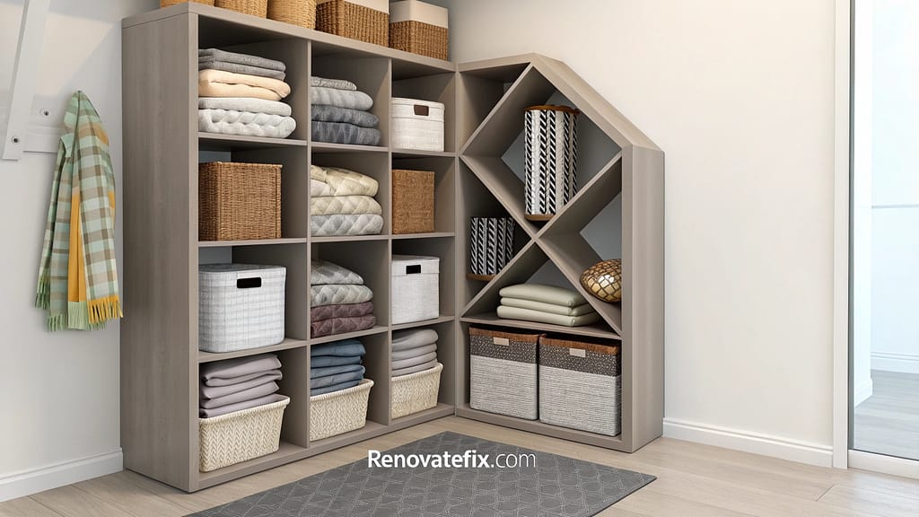 Design a corner-specific shelving system with varying cubby sizes accommodating different blanket dimensions.