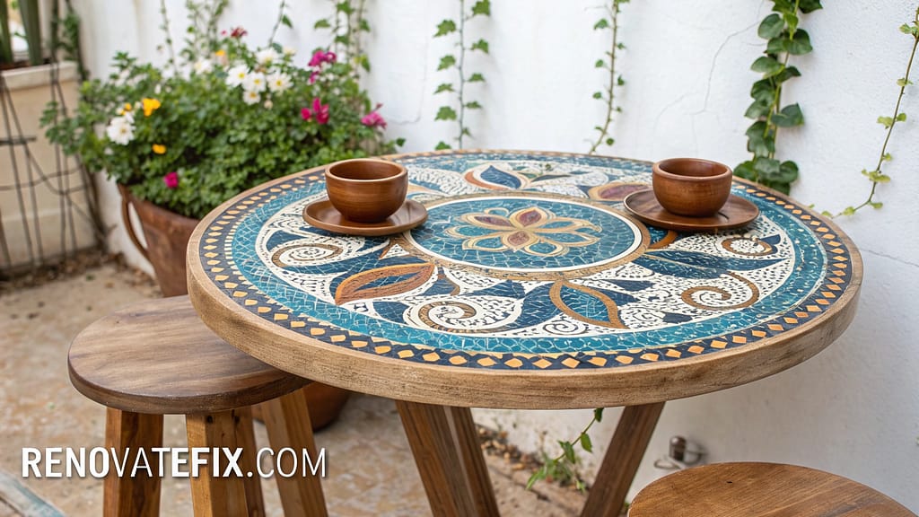 Hand-set tile fragments arranged in spiraling patterns or abstract designs across tabletops bring artistic focal points to gathering spaces while honoring ancient mosaic traditions.