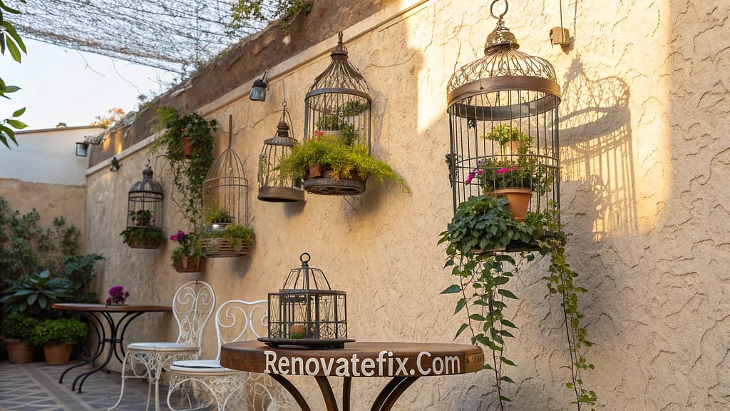 Ornate vintage birdcages reimagined as plant holders suspend botanical elements against bare walls or from overhead structures, adding victorian whimsy to bohemian outdoor spaces.