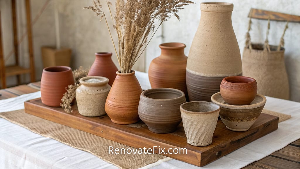 Grouped handcrafted pottery pieces arranged in intentional compositions bring sculptural elements and natural materials into outdoor living spaces without overwhelming more prominent features.