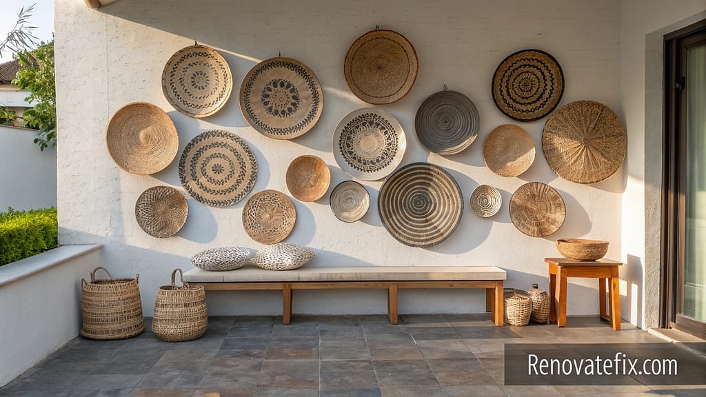 Handwoven baskets from various cultural traditions arranged in purposeful compositions create textural wall installations bringing warmth and dimensional interest to outdoor living areas.