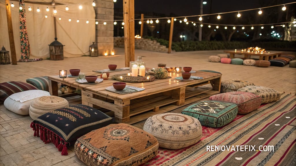 Ultra-low dining tables surrounded by floor cushions, poufs, and bolsters create relaxed eating environments encouraging extended mealtime conversations and communal serving styles.