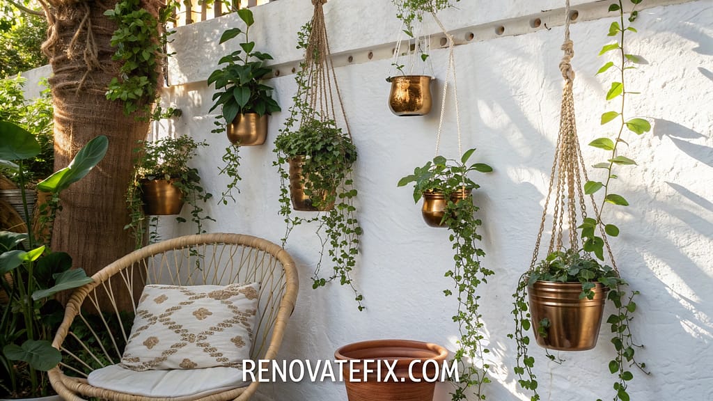 Spider plants, pothos, string of pearls, and trailing succulents housed in handmade ceramic vessels or repurposed containers form vertical gardens that maximize limited floor space.