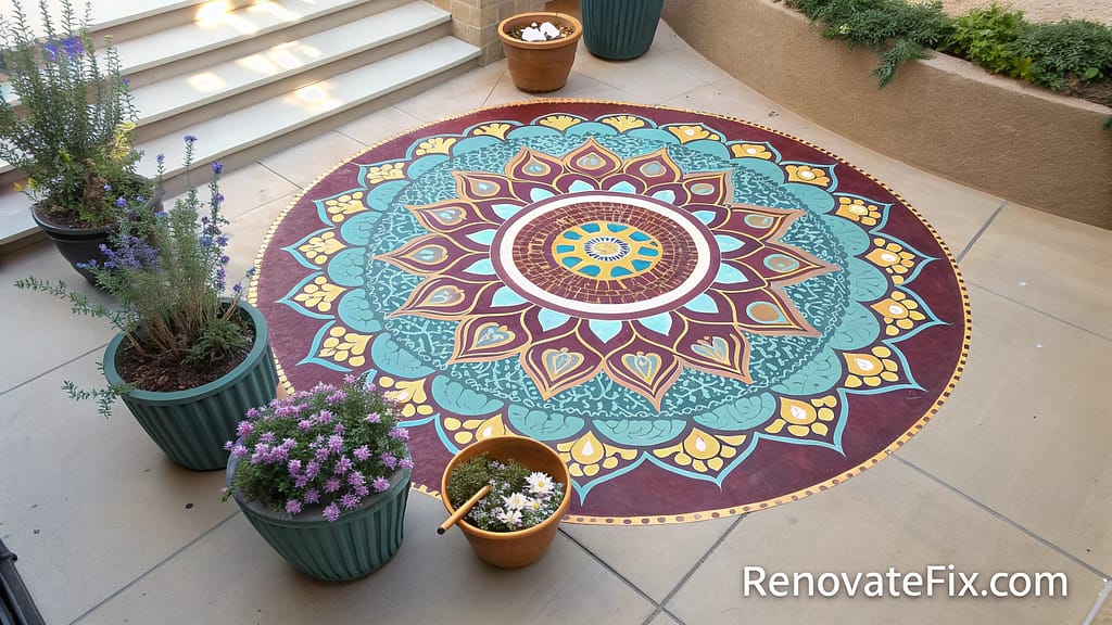 Concrete or wooden deck surfaces transformed through hand-painted mandala patterns create sacred-feeling spaces that ground energy and define specific areas without requiring walls or barriers.