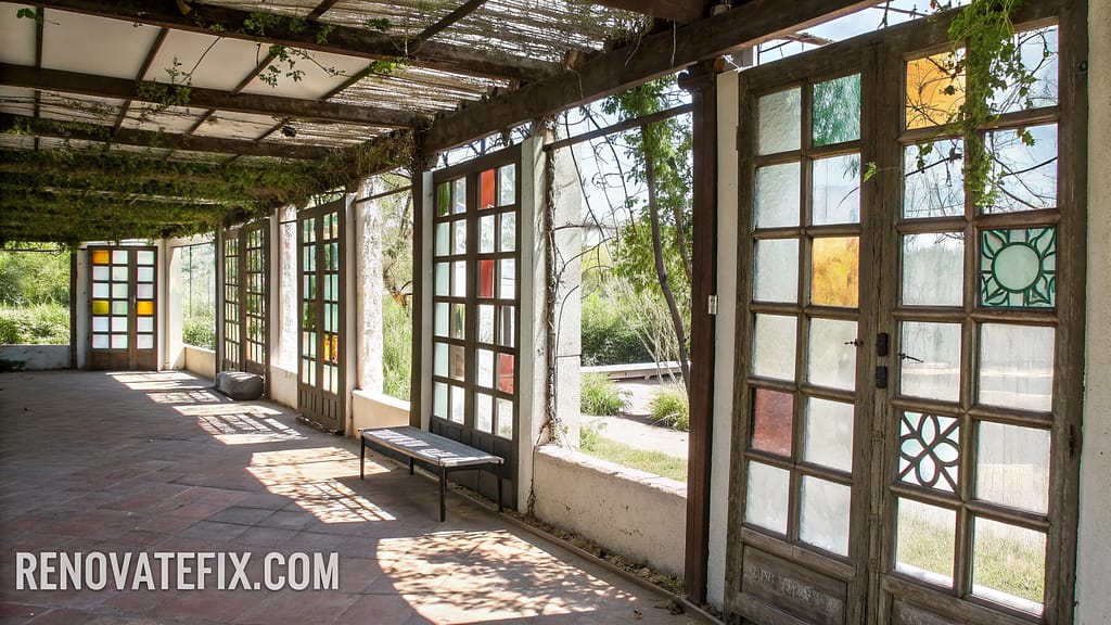Architectural salvage elements repurposed as spatial dividers bring historical character while creating distinct zones without constructing permanent walls that might obstruct breezes or natural light flow.