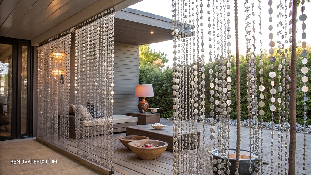 Strung on durable cords and suspended from overhead structures, these kinetic installations provide semi-private separation while maintaining airflow between distinct patio zones.