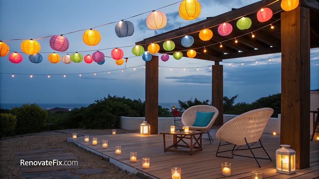 Fabric-covered lanterns in varying sizes suspended across overhead wires create magical evening environments that transform ordinary spaces into extraordinary experiences after sunset.
