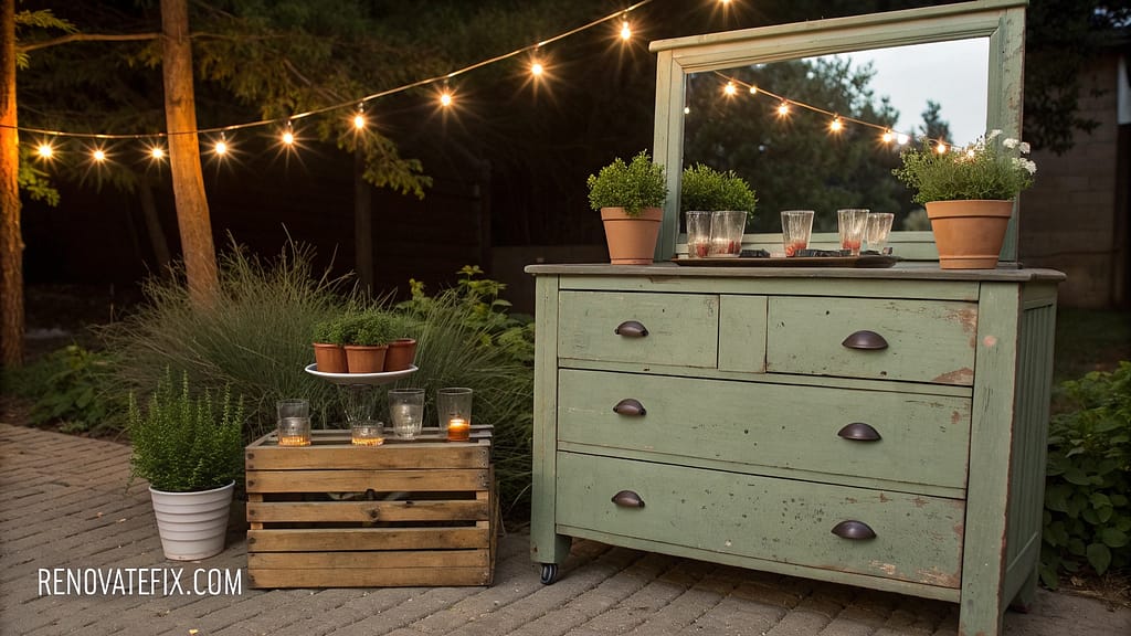 Estate sale furniture discoveries weatherproofed through careful techniques become unexpected outdoor storage solutions with distinctive character unavailable in commercial patio collections.