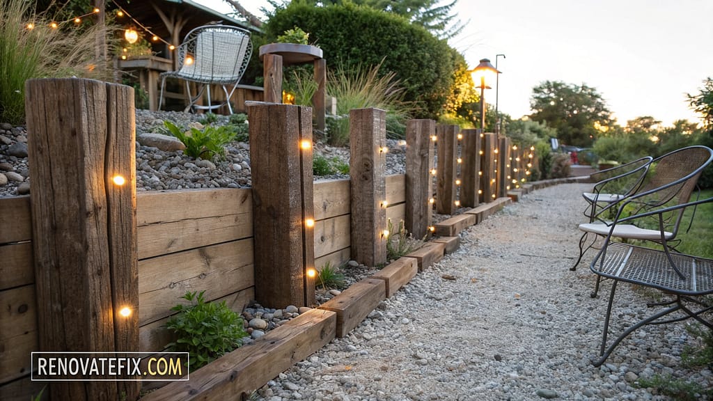 Reclaimed wooden railway ties arranged vertically create distinctive border elements defining outdoor room boundaries while adding substantial height without blocking sightlines or breezes.