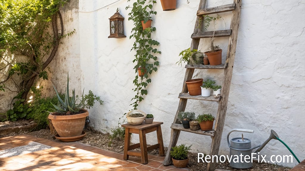 Vintage wooden ladders positioned against walls or freestanding in corners create multi-tiered display opportunities for botanical collections while adding vertical architectural elements.