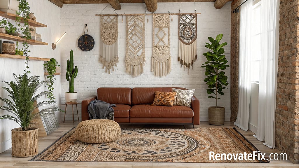Macramé wall hanging crowns brown leather couch while layered vintage rugs warm floors.