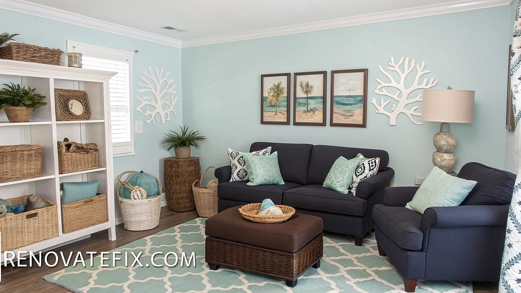 Light blue walls provide an airy backdrop while woven baskets add natural texture to complete this seaside-inspired setting.