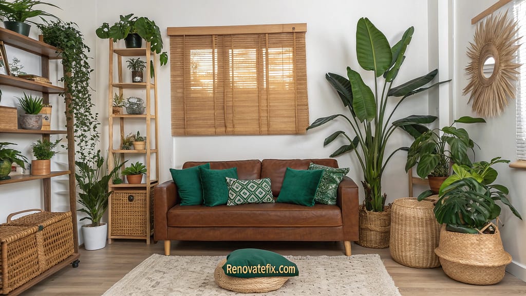Emerald velvet pillows echo plant life while rattan planters add organic texture.