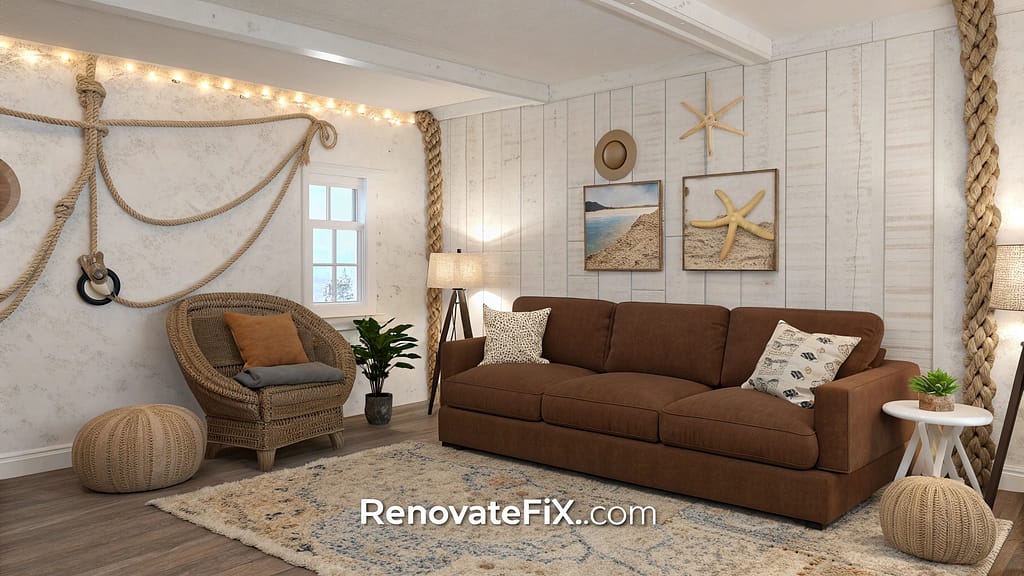 Slipcovered chairs complement brown sofa while rope details add coastal touch.